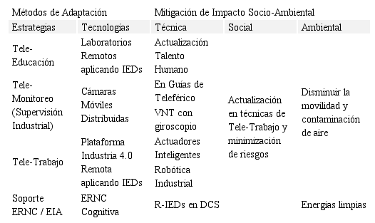 Un conjunto de criterios y técnicas de remediación ambiental han sido analizados en (Sandoval-Ruiz, 2019a), donde se analizan las alternativas para protección de los recursos naturales: tecnologías de filtrado, fitoremediación, aplicación de algas marinas, tiempos de recuperación, clasificación inteligente y reutilización de materiales y componentes, eficiencia termodinámica y recuperación de calor ambiental para protección de glaciares y áreas forestales, reconfiguración dinámica de los sistemas de potencia, tecnología circular, protección de hábitat y ecosistemas de flora y fauna, empleo soportado en teletrabajo y actualización tecnológica, educación ambiental, monitoreo en línea de condiciones del sistema y soporte distribuido. Algunos aspectos de las técnicas de adaptación se presentan en la Tabla 4.