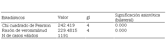 Adicionalmente, para la primera hipótesis de investigación se aprecia en la Tabla 8 (tabla de contingencia), donde los resultados de la prueba chi cuadrado tienen un nivel de confianza del 95%, que el valor calculado del chi cuadrado de Pearson (242.419) fue mayor al valor crítico del chi cuadrado (9.4877). Asimismo, se obtuvo que el coeficiente de significancia (. = 0.000) fue menor a 0.05 (. < 0.05), lo cual permitió aceptar la hipótesis de investigación.