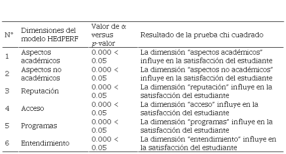 De igual manera, para la contrastación de la segunda hipótesis de investigación, mediante la cual se trató de probar que cada una de las dimensiones del Modelo HedPerf influye en la satisfacción del estudiante, se comprobó a través la prueba no paramétrica chi cuadrado que estas seis dimensiones influían en la satisfacción del estudiante (ver Tabla 9). Por otra parte, se realizó la comprobación de la influencia de las seis dimensiones en la satisfacción de los estudiantes según su casa de estudio de procedencia (UNALM, UNMSM y UNI), concluyéndose de igual manera que existe una relación de dependencia.