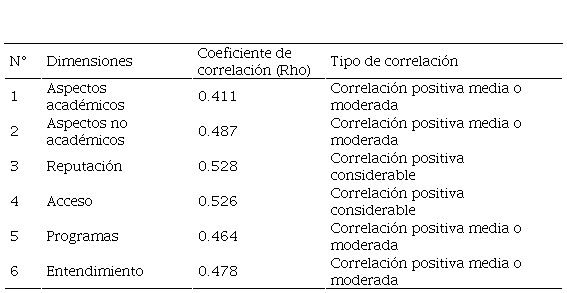 Además de ello, se realizó el mismo análisis discriminando los resultados según la casa de estudios de procedencia. De ahí se obtuvo que para los estudiantes de la UNALM, las dimensiones que presentaron una correlación positiva moderada fueron: aspectos académicos, aspectos no académicos, reputación, programas y entendimiento; mientras que la única dimensión que obtuvo una correlación positiva considerable fue la dimensión acceso. Con respecto a la UNMSM, se tuvo a las dimensiones aspectos académicos y entendimiento con una correlación positiva moderada; mientras que las demás dimensiones obtuvieron una correlación positiva considerable. Por último, la UNI obtuvo una correlación positiva moderada para las seis dimensiones evaluadas.