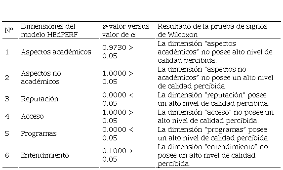 Se logró comprobar la tercera hipótesis de investigación mediante la prueba de signos de Wilcoxon, determinándose los niveles de calidad percibida para cada una de las dimensiones del Modelo HEdPERF; obteniéndose que cuatro de las seis las dimensiones evaluadas (aspectos académicos, aspectos no académicos, acceso y entendimiento) no poseen un alto nivel de calidad percibida, mientras que, las dos dimensiones restantes (reputación y programas) obtuvieron altos niveles calidad percibida.