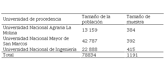 El tamaño total de la muestra de la investigación, según se aprecia en la Tabla 2, fue de 1191 alumnos matriculados y este se calculó utilizando los valores históricos del número de alumnos matriculados entre los años 2014 y 2018 con la finalidad de proyectar el promedio de alumnos matriculados para el año 2019; posteriormente, se empleó la fórmula para el cálculo del tamaño de muestra para una población finita, con un nivel de confianza del 95%, y se obtuvo para cada universidad del estudio la siguiente distribución: