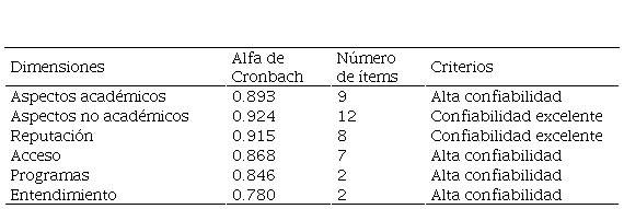 La consistencia interna de los ítems que componen cada una de las seis dimensiones de la escala HEdPERF, demostró que la encuesta es confiable en la medida en que sus dimensiones obtuvieron coeficientes de alfa de Cronbach con valores que oscilan entre 0.780 y 0.924. Esto último se condice con los resultados obtenidos por los autores Abdullah (2006) y Brochado (2009), quienes concluyeron que la escala HEdPERF es la que se ajusta mejor al contexto de la educación superior en comparación con otros instrumentos “clásicos” de medición como son el SERVQUAL y el SERVPERF.