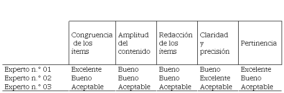 La validación del contenido de la encuesta se realizó a través de la técnica de juicio de expertos; para ello se contó con la participación de 3 docentes universitarios, los cuales son especialistas en los campos de evaluación de pruebas psicométricas, evaluación de tesis de posgrado y gestión de calidad de servicios educativos. En consecuencia, los expertos a través de 5 criterios de evaluación (congruencia de los ítems, amplitud del contenido, redacción de los ítems, claridad y precisión, y pertinencia) manifestaron sus opiniones, que fluctuaron entre las valoraciones de aceptable y excelente (ver Tabla 5) lo que dio la confianza para validar el contenido del instrumento de medición.