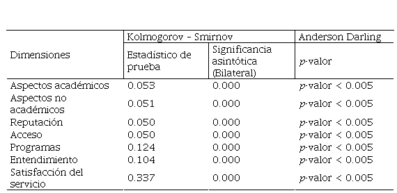 La comprobación del supuesto de la normalidad de la distribución de los datos de las variables (a) calidad percibida del servicio educativo y sus subvariables (dimensiones del modelo HEdPERF) y (b) satisfacción del estudiante, se realizó a través de las pruebas de normalidad Kolmogorov Smirnov (SPSS versión 25) y Anderson Darling (Minitab versión 17). Se concluyó que presentan distribuciones no normales, puesto que poseen un .‑valor menor a 0.05 (valor de α), con un intervalo de confianza del 95% y, por consiguiente, se procedieron a contrastar las hipótesis de investigación mediante pruebas estadísticas no paramétricas (ver Tabla 6).