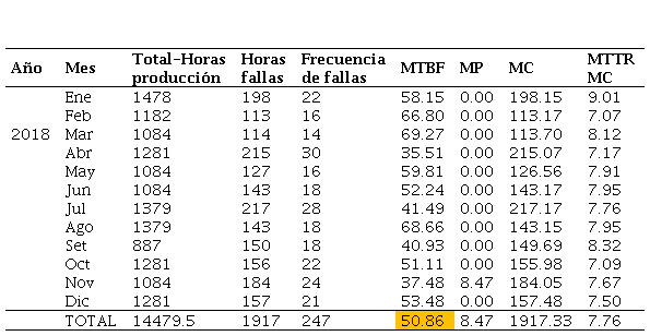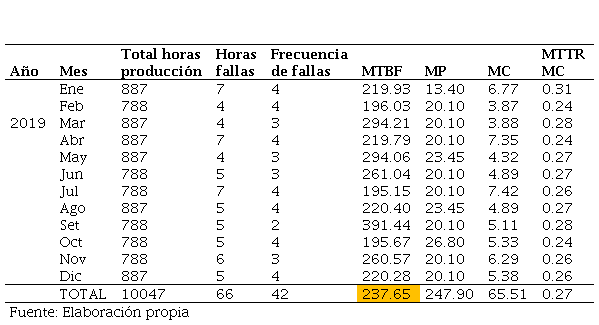 Los índices de MTBF (tiempo medio entre fallas) y MTTR (tiempo medio para reparar) también son importantes. Al calcular el MTBF anual se nota que su valor se ha incrementado de 50.86 horas a 237.65 horas y se ha reducido el MTTR de 7.76 horas a 0.27 horas, como se muestra en las Tablas 9 y 10.