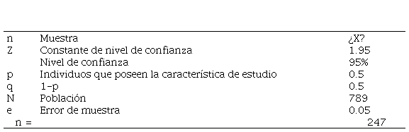 Para el cálculo del tamaño de la muestra se ha considerado una población N de 789 piezas (producción total del año 2018). El valor de Z se refiere al nivel de confianza, el cual ha sido seleccionado al 95%; en consecuencia, el error (E) será de 0.05. En la Tabla 2 se muestra el cálculo del tamaño de muestra.