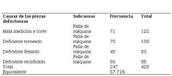 Los problemas ocurrieron por los trabajos realizados con deficiencia en las áreas de medición y corte, torneado, fresado y rectificado. En ellos tiene gran incidencia la ocurrencia de fallas en las máquinas (58.2% en medición y corte; 54.35% en torneado; 54.22% en fresado y 65.8% en rectificado).