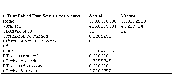 Para validar las hipótesis planteadas, utilizaremos una prueba t de student para muestras emparejadas, seleccionando una confiabilidad del 95%. Una vez obtenido el resultado, la hipótesis nula se rechazará si t < -2.776 y si t > 2.776. Utilizaremos los datos tomados antes y después de la implementación de TPM en cuanto a los valores de OEE actual y mejorada, como se muestra en la Tabla 4.