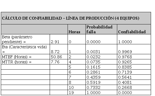 Así mismo, se calcularon los indicadores MTBF y MTTR: El valor de MTBF fue de 50.86 horas, lo que significa que cada 50.86 horas ocurre una falla en cualquiera de los 4 equipos, y el tiempo medio de reparación por cada MC es de 7.76 horas como promedio. Con estos datos podemos calcular la confiabilidad de los equipos como se muestra en la Tabla 5.