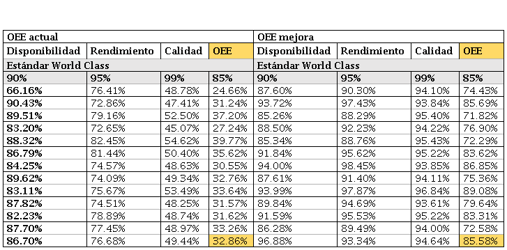 Al cumplir con los MP se reducirán los MC, ya que, por la falta de los primeros, ocurren las fallas mecánicas de los equipos y la necesidad de los segundos; por esto, al pronosticar la frecuencia y horas de MP y MC, se ha calculado el siguiente OEE: