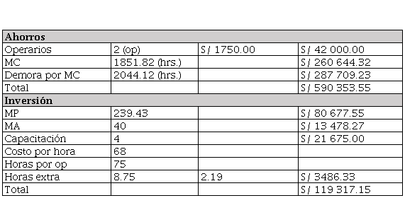 Es posible cuantificar los ahorros obtenidos por la implementación del TPM, los cuales ascienden a S/ 590 353.55 como consecuencia de reducir el número de operarios y las horas y demora por MC. Por su parte, la inversión es de S/119 317.15 por el incremento de MP y MA y por la capacitación a los operarios para una debida gestión de los trabajos de mantenimiento. Esto se muestra en la Tabla 7.