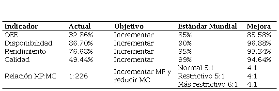 Como resultado final, se concluye que al mejorarse el cumplimiento de los MP (mantenimientos preventivos) y MA (mantenimientos autónomos) se han mejorado el factor calidad (de 49.44% a 94.64%), el factor rendimiento (de 76.68% a 93.34%), y, por ende, se incrementó el factor disponibilidad (de 86.70% a 96.88%), con lo que se logró incrementar el OEE de 32.86% a 85.58%, excediendo el índice mundial de 85. Además, la relación de mantenimientos preventivos y correctivos también mejora de 1:226 a 4:1. En la Tabla 8 se muestran los indicadores.