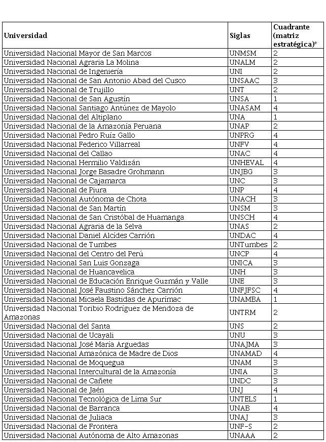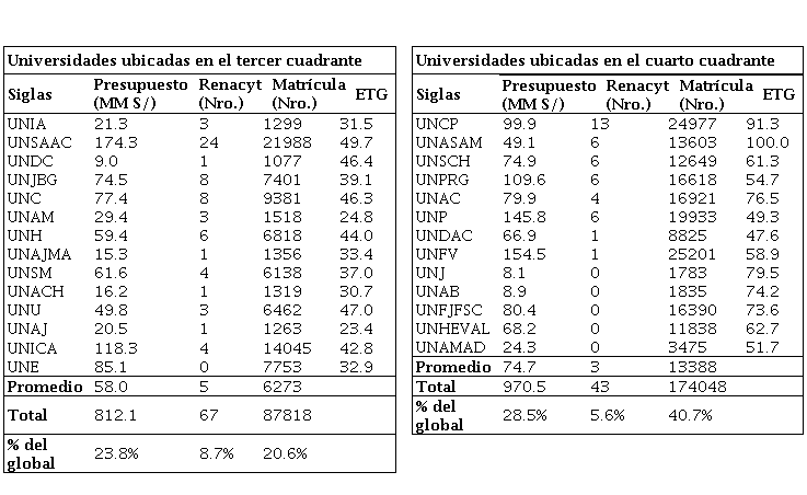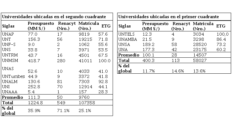 En el primer cuadrante (superior derecho), se ubican las instituciones con orientación a la investigación y a la masificación, lideradas por la UNTELS. En el segundo cuadrante (superior izquierdo), se ubican las universidades con alta orientación a la investigación, encabezadas por la UNMSM y la UNALM con los niveles más altos de todas las instituciones; además, se ubican también las de baja orientación a la masificación. En el tercer cuadrante (inferior izquierdo), se ubican las universidades con baja orientación tanto a la investigación como a la masificación, que es la peor situación de los cuatro tipos de desempeño analizados. Finalmente, en el cuarto cuadrante (inferior derecho), se ubican las universidades con baja orientación a la investigación, pero alta orientación a la masificación, que son encabezadas por la UNASAM.