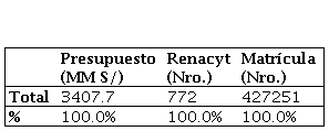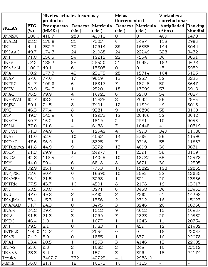 Se empleó como único insumo el presupuesto en millones (MM) de soles de cada universidad y dos productos: número de investigadores adscritos al programa Renacyt (antiguo Regina) y número de estudiantes de pregrado, maestría y doctorado matriculados, con base en un modelo propuesto por Ramírez y Alfaro (2013), el cual fue ligeramente modificado para medir la función de investigación. Otros insumos, como por ejemplo número de docentes, tienen alta correlación en el presupuesto en las universidades públicas. Asimismo, en esta investigación no se pudo especificar la cantidad de artículos en revistas indexadas por universidad, tal como se mencionó anteriormente, debido a que no están disponibles.