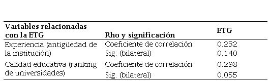 Las variables a correlacionar con la ET fueron la antigüedad (años), que refleja la experiencia de la institución, y la calidad educativa medida con una variable proxy, tal como es el puesto que ocupa la institución en el ranking de universidades elaborado por el CSIC (2019), el cual va de 1 a 25000, en donde 1 es el valor más deseable. Con el fin de establecer relaciones positivas con la ETG, se optó por invertir los valores del ranking, aplicando la función inversa (1/ranking), luego se determinó el porcentaje de la participación relativa de cada universidad (índice de ranking mundial) en el total de los valores de la función inversa, lo cual garantiza que a mayor valor corresponde una mayor calidad de la institución educativa.
