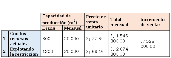Para Niebel y Freivalds (2004), la posibilidad para que un negocio crezca y aumente sus ganancias radica en el aumento de su productividad. Este mejoramiento de la productividad se traduce en un incremento de la cantidad de producción durante las horas de trabajo empleadas, tal como se puede apreciar al final de la aplicación del paso 4 del TOC, en donde la capacidad de la producción aumentó después de la implementación de las acciones de mejora y la inversión.