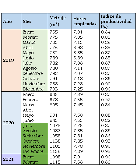 La aplicación del modelo de balance de línea permite comparar la capacidad de producción antes y después de la implementación del modelo. En esta investigación, se realizará primero una contrastación de la hipótesis planteada, la cual consiste en determinar si se logró incrementar la productividad de la línea de procesamiento de vidrio templado. Para esto, se presenta la Tabla 1 con información de la producción extraída desde enero de 2019 hasta febrero del 2020, en donde se puede apreciar el índice de productividad de los meses en los que se aplicó el modelo de balance línea. En la información presentada del año 2019, se puede apreciar el índice de productividad antes de la aplicación del modelo de balance de línea. De enero a junio de 2020, se aprecia un incremento del índice de productividad debido a las primeras acciones de mejora realizadas con los propios recursos del área; es importante tener en cuenta que en marzo solo se trabajó hasta el día 16 y en abril no se registra la cantidad de producción puesto que la planta estuvo cerrada por la pandemia del COVID-19. Finalmente, entre julio de 2020 y febrero de 2021 se obtienen otros valores del índice de productividad después de la aplicación del paso 4 de la teoría de restricciones (TOC).