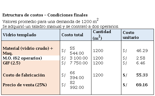Del cuadro presentado, se deduce que el valor unitario de venta por m2 es de S/ 77.34, que equivale a $ 21.48 ≈ $ 22.00, el precio actual del mercado por m. para un vidrio de 8 milímetros de espesor, esto calculado para una capacidad de procesamiento de línea de 800 m2. En la Tabla 3, se puede apreciar la estructura de costos resultante después de la aplicación del paso 4.