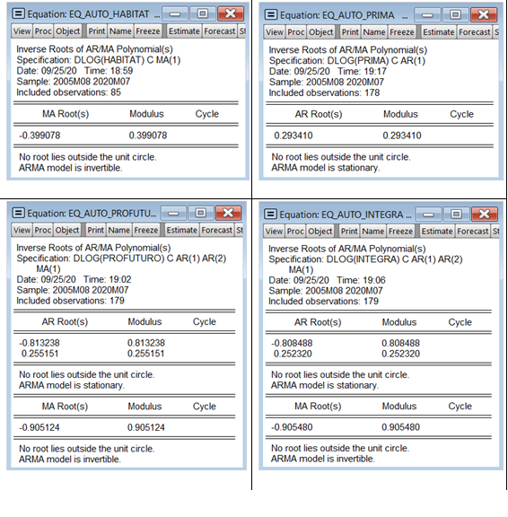 Se realizó la validación con el círculo unitario y, tal como se observa en la Figura 8, los modelos son estacionarios en la parte autorregresiva para las AFP Prima, Profuturo e Integra. Asimismo, se observa que los modelos de las AFP Habitat, Profuturo e Integra son invertibles en la parte del promedio móvil. Ninguna de las raíces de las cuatro AFP está fuera del círculo unitario, y todos sus módulos están por debajo de 1, por lo que se concluye que pasaron las pruebas de validación de círculo unitario.