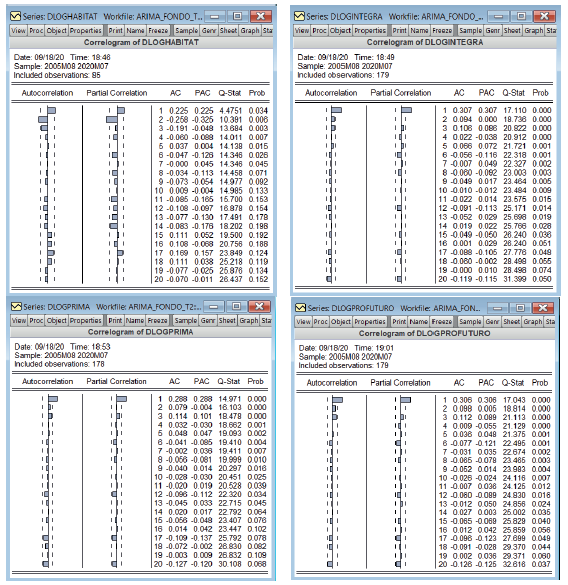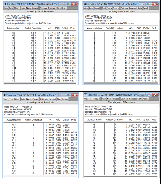 En esta parte se verificó que la serie de tiempo ya diferenciada tuviera memoria utilizando correlogramas y el estadístico Ljung Box (LB) para muestras pequeñas. En la Figura 6 se tienen los correlogramas para Habitat, que mostraron que hasta el mes siete no tiene ruido blanco y, a partir del mes ocho, el impacto a la serie actual de Hábitat no es significativo. En el caso de Integra, hasta el mes quince no tiene ruido blanco. Con respecto a Prima, hasta el mes trece no tiene ruido blanco. Finalmente, Profuturo no tiene ruido blanco hasta el mes dieciséis y, posterior a este mes, el impacto no es significativo en el resultado de la serie actual. En conclusión, las series diferenciadas de las AFP Habitat, Integra, Prima y Profuturo son estacionarias y no tienen ruido blanco y, por tanto, pueden pronosticarse con la metodología Box y Jenkins.