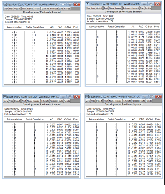 Los residuos al cuadrado de las 4 AFP también presentaron ruido blanco, ya que todos sus p-valores están por encima del 5%, tal como se aprecia en la Figura 10; de no haber sido el caso, habría sido necesario realizar una ecuación a la varianza para luego ser trabajados con los modelos de volatilidad condicional ARCH y GARCH.