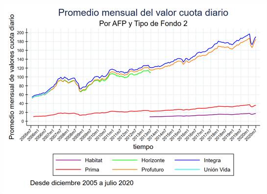 El fondo tipo 2 inicia en diciembre del 2005. Sus inversiones están distribuidas 55% en renta fija y 45% en renta variable, con un perfil balanceado destinado a trabajadores de 45 a 60 años. En la Figura 1 se observa una leve tendencia al alza con fuerte caída durante la crisis mundial entre el 2007 y el 2008; un leve descenso en abril del 2011 y 2016 en las primeras vueltas electorales, al igual que entre el 2018 y 2019, que culminó con el cierre del congreso de la República; y un fuerte retroceso en marzo del 2020 como consecuencia del COVID-19. Este desenvolvimiento corresponde al promedio mensual en soles de los valores cuota diarios para el cálculo de la rentabilidad de las AFP del fondo tipo 2.