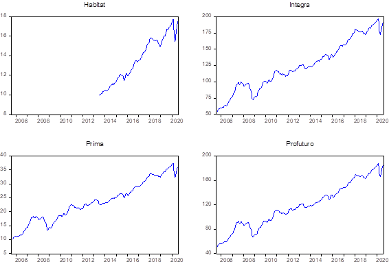 Son pruebas no formales. Court y Rengifo (2011) sostienen que se determina el modelo y el orden que mejor se ajusten a los datos, puesto que se utilizan los métodos gráficos y los criterios de información. En la Figura 2 se aprecia el desenvolvimiento de las series mensuales de las AFP Habitat, Integra, Prima y Profuturo, que presentan tendencias al alza.