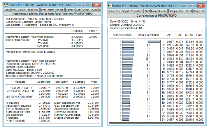En la Figura 2 se aprecia que la serie original de la AFP Profuturo presenta tendencia, pero, en los resultados del modelo en la Figura 3 (lado izquierdo), tiene p-valor igual a 4.95%, es decir, menor a 5%, por lo que se rechaza la H0 de tener RU y, por lo tanto, es estacionaria; sin embargo, en la misma Figura 3 (lado derecho), se observa que la autocorrelación no decae exponencialmente para corroborar que la serie original sea estacionaria, por el contrario, esta decae linealmente, lo que indica que no es estacionaria y debe diferenciarse.