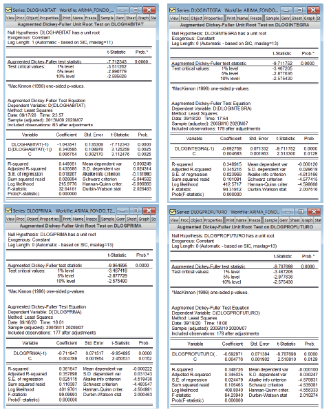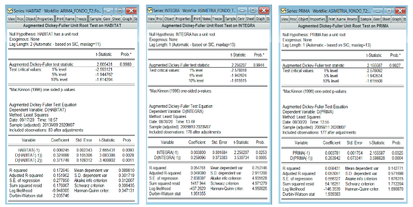 Se realizaron las pruebas de raíz unitaria Dickey Fuller Aumentado (DFA), que según Bello (2018) son las pruebas de mayor utilización, a las series originales de Habitat, Integra, Prima y Profuturo.