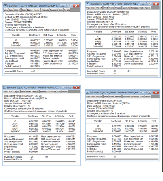 Con base en los resultados de los correlogramas, se identificaron el orden del AR y MA, con el uso de la máxima verisimilitud, ensayo y error, a partir de la significancia estadística de cada coeficiente estimado. Con ayuda del software Eviews, se seleccionó automáticamente el mejor modelo, ejecutando iteraciones con combinaciones de los AR, MA y orden de integración. En este caso, se realizaron 484 modelos para cada AFP, y se eligió el modelo que tuvo el menor Akaike Info Criterion (AIC), tal como se aprecia en la Figura 7.