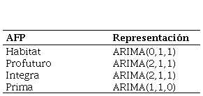 Se puede apreciar en la Tabla 2 que la AFP Habitat tiene el menor error de pronóstico con ARIMA, pues su RMSE, en promedio, se desvía en 0.2796 unidades y en términos porcentuales o MAPE, el desvío es 1.20%. Por su parte, la AFP Integra es la que tiene el mayor RMSE con respecto a las otras tres AFP, ya que este indica un desvío de 2.8076 unidades. En términos porcentuales, la AFP Prima tiene el mayor desvío con 1.66%.