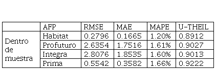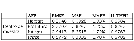 Curt y Rengifo (2011) sostienen que “Para determinar si un pronóstico es adecuado, se usan los estadísticos que (…) comparan los valores reales con aquellos que han sido pronosticados. (…) como los errores pueden ser positivos o negativos, (…) suma de ellos no sería de gran ayuda puesto que se cancelarían entre ellos. Es por eso que los índices trabajan ya sea con los errores al cuadrado o con el valor absoluto de los errores” (pp. 427-428); siguiendo esta línea, se pasan a realizar pronósticos estáticos del promedio mensual de los valores cuota de cada una de las cuatro AFP, a fin de tomar en cuenta los siguientes estadísticos de error: RMSE (Raíz de error cuadrático medio), MAE (Error absoluto medio), MAPE (Error Porcentual Absoluto Medio) y U-THEIL (Coeficiente de desigualdad de Theil), los cuales están contenidos en la Tabla 2.