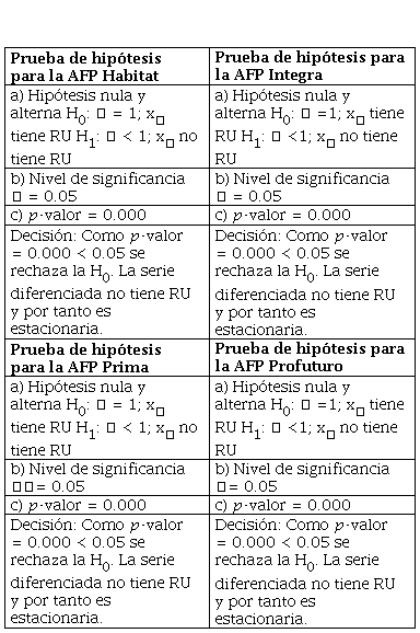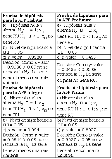 En la Tabla 4, se aprecia que la serie original de la AFP Profuturo no presenta tendencia y su p-valor es igual a 4.95%, menor a 5%, por lo que se rechaza la H0 de tener raíz unitaria y, por tanto, la serie es estacionaria. En la misma Tabla 4, se aprecia que los p‑valores de Habitat, Integra y Prima están por encima del 5%, entonces no se rechazan las H0, pues estas tienen al menos una raíz unitaria y no son estacionarias.