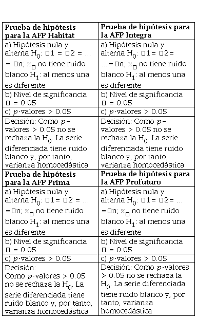 Se verifica que las series diferenciadas no tienen memoria utilizando el estadístico Ljung Box (LB) para muestras pequeñas. Las pruebas conjuntas para los residuos al cuadrado de las cuatro AFP presentan ruido blanco, pues todos sus p-valores están por encima del 5%, tal como se aprecia en la Tabla 6.