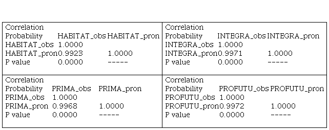 En la Tabla 7, se aprecia que los resultados de los coeficientes de correlación de los valores observados del promedio mensual de los valores cuota por cada AFP del fondo tipo 2 y los valores pronosticados corresponden a correlaciones positivas fuertes; en la tabla también están contenidos sus p‑valores.