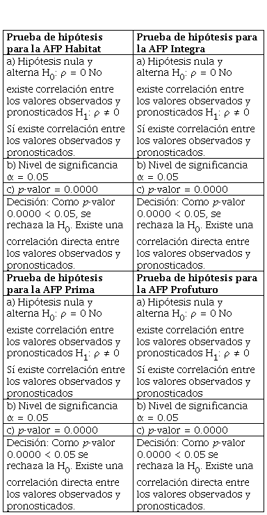 En las pruebas de hipótesis contenidas en la Tabla 8, se observa que los p‑valores de cada una de las AFP están por debajo del 5%, por tanto, además de existir una correlación fuerte y directa entre los valores observados y pronosticados, estos pueden ser corroborados con los resultados de los estadísticos de error contenidos en la Tabla 3.