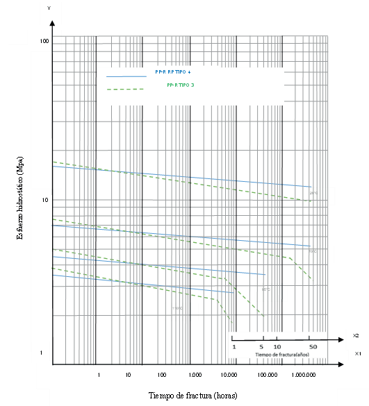 En la Figura 1 se observan las diferencias entre las curvas de referencia para las resistencias esperadas tanto del PP-R tipo 3 como del PP-R tipo 4, donde se observa que la curva del PP-R tipo 4 tiene una menor pendiente, lo que quiere decir que tiene un excelente comportamiento a elevadas temperaturas en comparación con el PP-R tipo 3.