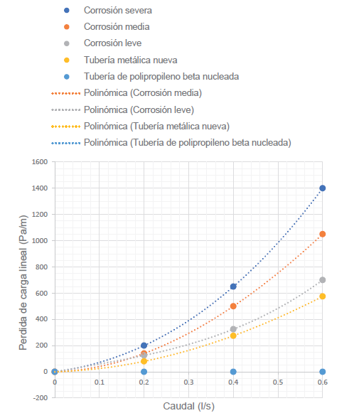 La pérdida de carga que se produce en las tuberías metálicas varía en función del estado de corrosión que existe en las mismas. En la Figura 2 se observan los resultados publicados por Rahmeyer (2009, como se citó en Italsan, 2015), donde se relaciona el aumento de las pérdidas de carga en una tubería metálica en función de su estado de corrosión.