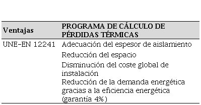 Los cálculos de espesor correspondientes se pueden realizar utilizando el software de cálculo de pérdidas del mercado internacional. El cálculo se basa en el coeficiente de conductividad térmica según UNE-EN ISO 12241:2010 (Organización Internacional de Normalización [ISO], 2010). Este procedimiento establece la pérdida de calor y la condensación de poros que se produce en la tubería (Tabla 2).