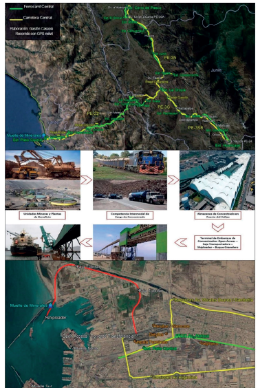 Se evalúa la cadena logística minera que comprende la competencia intermodal de la carga, es decir, desde las plantas en las unidades mineras hasta el Puerto del Callao, analizando (1) el Índice Medio Diario Anual (IMDA) de los vehículos que pasan por las estaciones de conteo de la Carretera Central y sus rutas alternas y (2) la demanda de trenes según los reportes de envíos del Ferrocarril Central. Así, se tiene el total de unidades que llegan a almacenamiento en el puerto, las mismas que proceden luego a despachar la carga minera por medios marítimos a través del movimiento de tráfico del Terminal de Embarque de Concentrados de Minerales en el Puerto del Callao.
