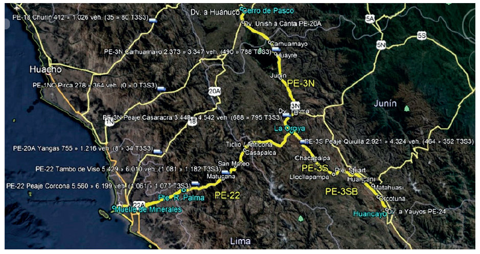 Es conveniente observar cómo el flujo de los medios de transporte pesado de seis ejes —como los camiones T3S3 (tractor de tres ejes y semitrailer de tres ejes) y los encapsulados mineros con que se trasladan los concentrados hacia puerto— han ido aumentando a razón de 1 a 5% anual en promedio, aunque en Carhuamayo (entre Cerro de Pasco y La Oroya) este aumento llegó hasta 20%, mientras que en otras rutas como la PE-18 en Churín (entre Huaura y Ambo) el incremento fue del 43% y en la PE-20A en Yangas (entre Lima y Unish) se llegó incluso a un 108% anual.
