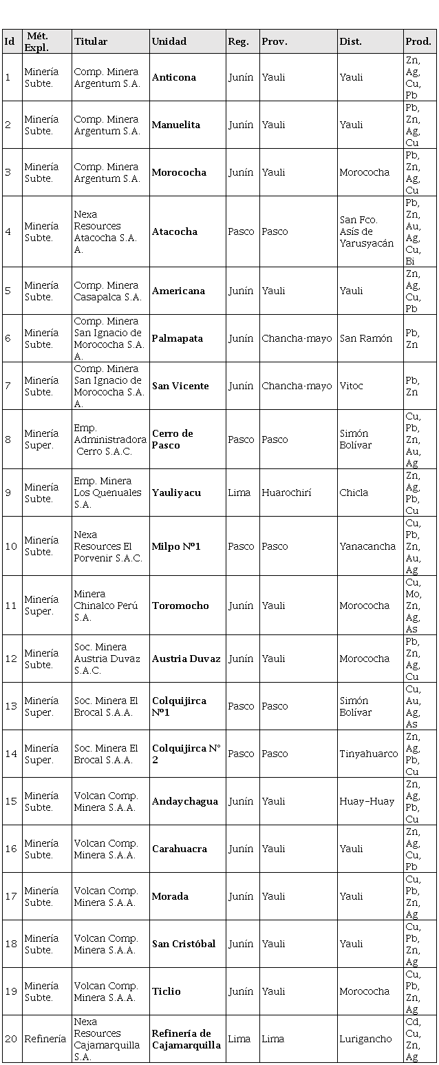 El área de influencia de la investigación abarca la Región Central del país, en la cual ha habido actividad de producción minera metálica por muchos años, particularmente en la orografía andina de las Regiones de Lima, Junín y Pasco. En consecuencia, la investigación se circunscribe directamente en 20 Unidades Mineras, en 15 de las cuales de aplica el método de explotación de minería subterránea; en 4, de minería superficial; y en 1, la de Cajamarquilla, de refinería (Ministerio de Energía y Minas [MINEM], 2018) (ver Tabla 1).