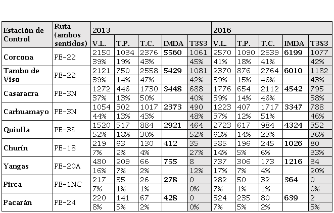 Debido a la dificultad para obtener información sobre el transporte de minerales a través de las carreteras del país, se realiza el conteo de las unidades de transporte terrestre al atravesar puntos de control o estaciones. De esta forma, el Ministerio de Transportes y Comunicaciones consigue el IMDA por tipo de vehículo según tramos viales. Para el ámbito de la Región Central, se toman en cuenta los datos del MTC (MTC, 2013 y MTC, 2016) —considerando que el 2016 fue el último año en que se publicó información de dicho ministerio— y se analizan la Tabla 2 y la Figura 2.