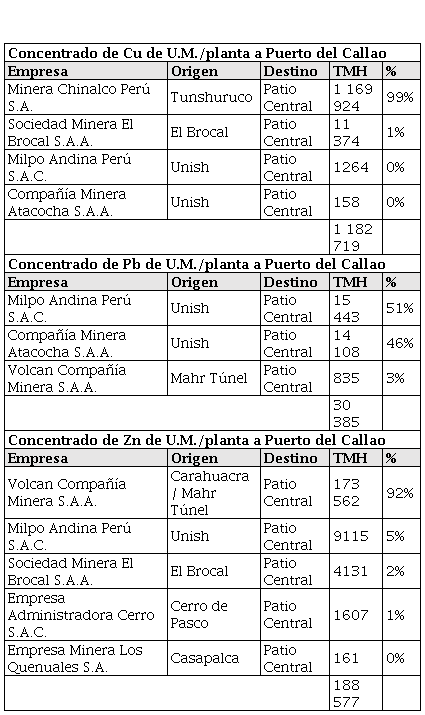 Con la información recolectada sobre las unidades mineras de la Región Central, y sus plantas concentradoras, se puede estimar la cantidad de camiones pesados que se desplazan por esta región, el número de vagones transportadores de concentrado de mineral y las exportaciones que hacen uso de la faja transportadora del Terminal de Embarque de Concentrados de Minerales del Callao.