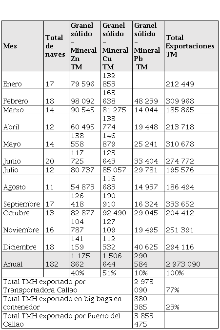 Se atendieron 182 naves o bulk carriers con un promedio de 16 336 TM, que sumó un total de 2 973 090 toneladas de carga para el año 2017, lo que representó el 77% del total exportado de concentrados de mineral en el Puerto del Callao y el 26% del total exportado en el Perú.