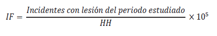 1. Índice de frecuencia de incidentes con lesión (IFIC). Según la OIT, el también llamado índice de accidentabilidad se obtiene de la división entre el número de incidentes laborales con lesión ocurridos durante el periodo de estudio y las horas hombre del grupo de referencia. La relación se multiplica por un número de ajuste, el cual, para su mejor interpretación, se ajusta según la magnitud de las horas trabajadas, las cuales pueden ser 100, 1000, 100 000, 1000 000, etc. (ILO, 2020).