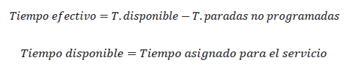Donde el tiempo disponible es el tiempo asignado por la organización que contrata el servicio (cliente) y el tiempo efectivo es el tiempo disponible menos el tiempo de paradas no programadas que hayan sucedido por interrupciones del servicio como incidentes, demoras en entrega de material, equipos, herramientas defectuosas, otras actividades o prioridades, etc.