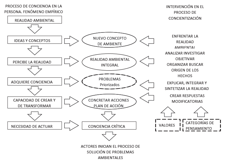 Freire establece tres fases para el proceso de sensibilización: la mágica, la ingenua y la crítica. Cabe resaltar que el modelo de sensibilización basado en las ideas de Freire surgió al plantearse un Programa de Concientización Ambiental (PCA) entre 1997-1999 (Chesney , 2008) (Figura 1).