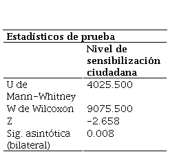 En la tabla 9 se muestran los resultados de la prueba U de Mann-Whitney para el nivel de sensibilización ciudadana. Se obtuvo un nivel de significancia de 0.008 < 0.05, por lo que se acepta la H1, lo que significa que la implementación de un programa de capacitación y sensibilización en medidas de protección de salud, higiene y seguridad influye favorablemente en el nivel de concientización ciudadana sobre el reciclaje.